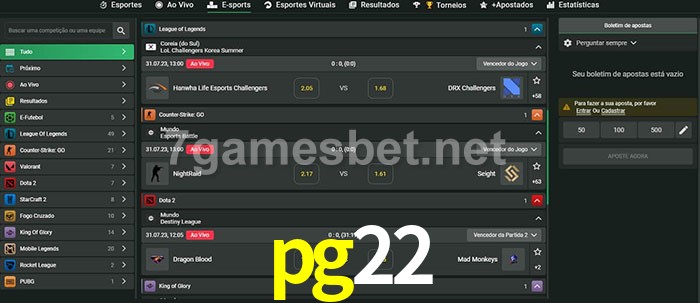 O pg22 oferece uma grande seleção de opções de apostas em e-sports com probabilidades competitivas